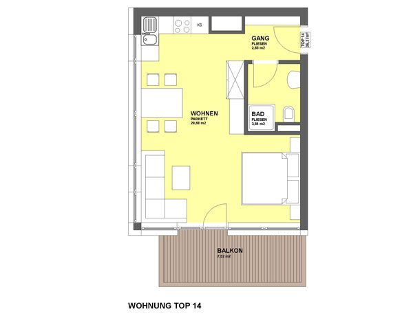 Ausstattung: Smart–TV, Fußbodenheizung, Eichenholzboden, Bad mit Dusche und WC, Balkon, Waschmaschine und Trockner im Haus vorhanden